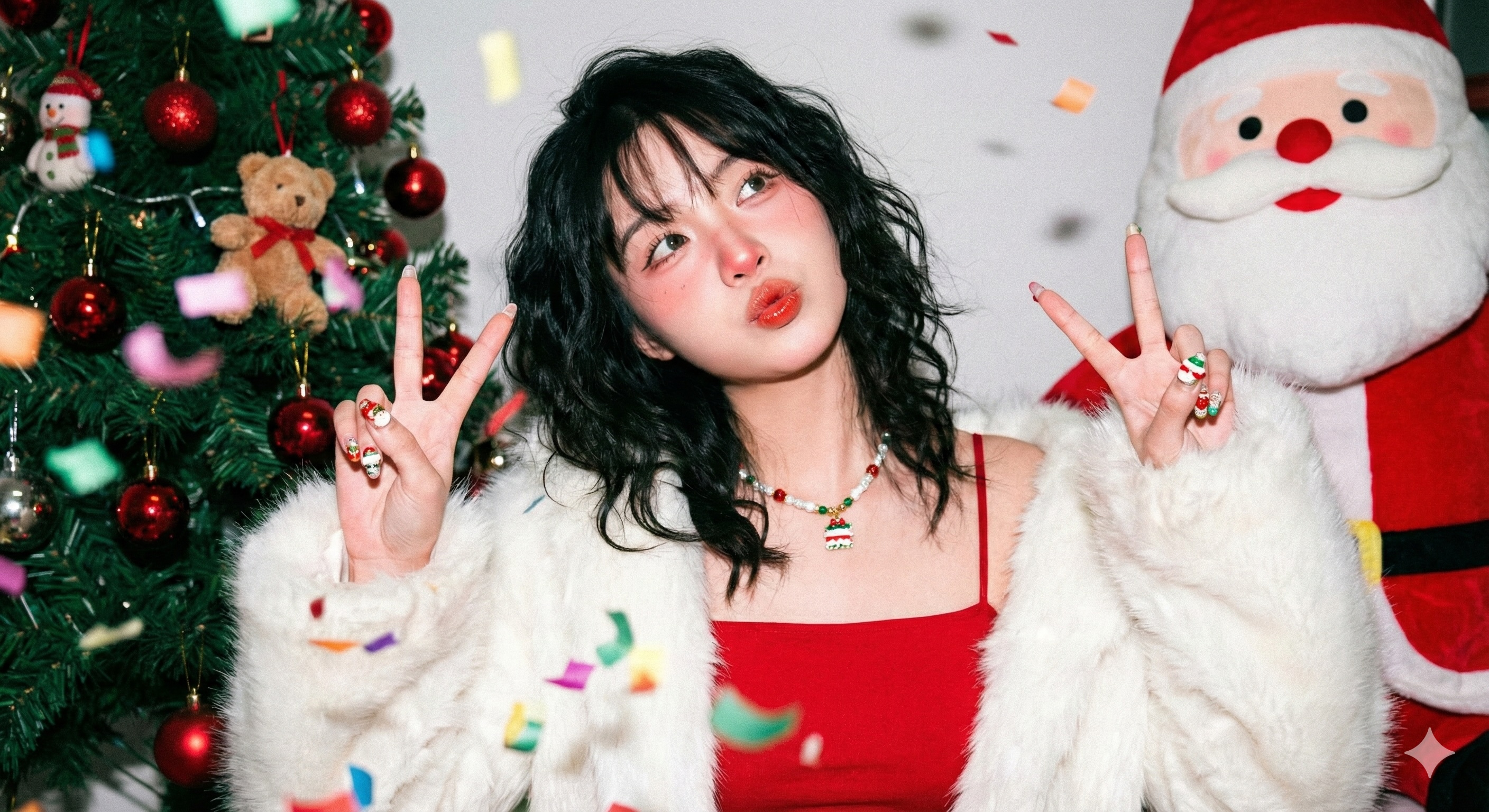 一、主體與身份 1. 年輕的亞洲女性 2. 臉部與原始參考圖百分之百相同,不做任何修改 二、服裝與整體造型 1. 內搭紅色細吊帶上衣 2. 外搭厚實蓬松的白色仿毛冬季外套 三、妝容與膚色 1. 妝容風格偏中國女孩風格 2. 面頰與鼻子上有粉色腮紅 3. 嘴唇為偏紅橘色的水潤質感唇妝 4. 膚色白皙細膩,帶有淡淡粉色調 四、髮型與細節 …